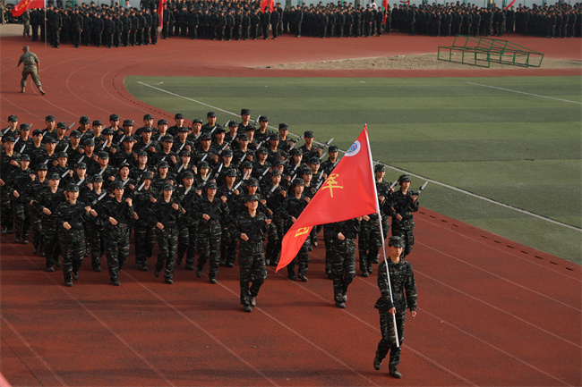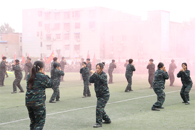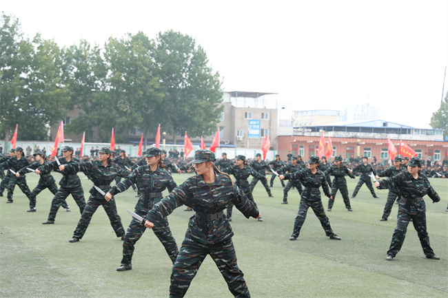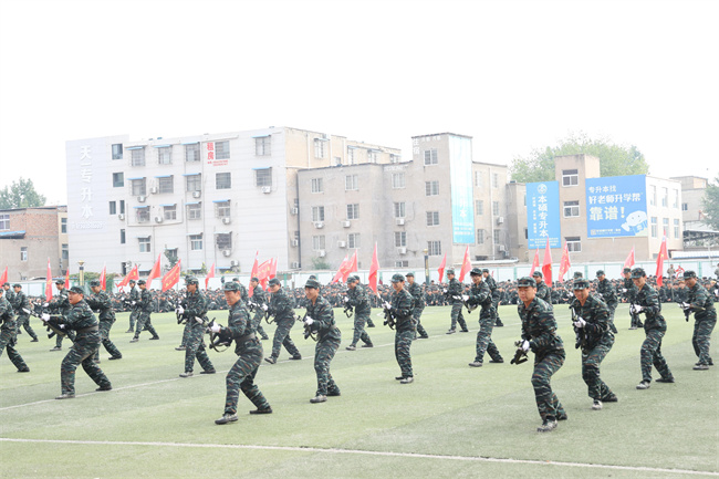 在激昂豪邁的軍樂聲中,51個(gè)軍訓(xùn)連隊(duì)精神抖擻、步履鏗鏘,依次通過主席臺(tái)接受檢閱,部分新生還進(jìn)行了擒敵拳、匕首操、刺殺操、戰(zhàn)術(shù)表演等軍事成果匯報(bào)。