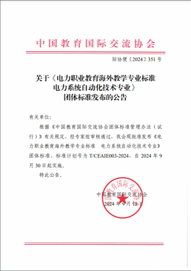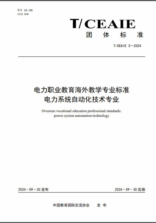 中新河南網(wǎng)10月10日電(黃詩雅) 近日,鄭州電力高等?茖W(xué)校牽頭制訂的《電力職業(yè)教育海外教學(xué)專業(yè)標(biāo)準(zhǔn)--電力系統(tǒng)自動化技術(shù)專業(yè)團(tuán)體標(biāo)準(zhǔn)》獲中國教育國際交流協(xié)會批準(zhǔn)發(fā)布,標(biāo)準(zhǔn)計劃號為T/CEAIE003-2024,并于2024年9月30日起正式實施。