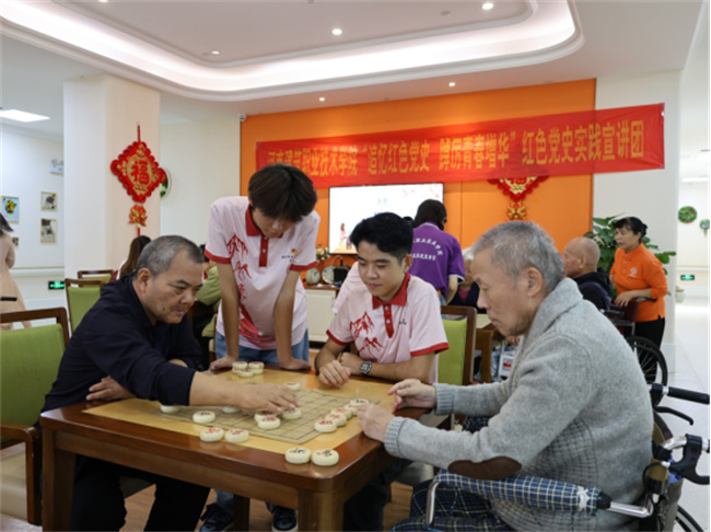 實(shí)踐宣講團(tuán)成員陪伴老人下棋