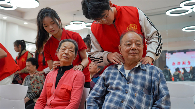 體育系組織師生為退休教師表演二十四式太極養(yǎng)生操,并由體育系教師講解秋冬季節(jié)的保健養(yǎng)生知識(shí)。同時(shí),學(xué)生志愿者們熱情為退休教師進(jìn)行康養(yǎng)按摩,沉浸式的互動(dòng)體驗(yàn),讓在場(chǎng)的師生們感受頗深。