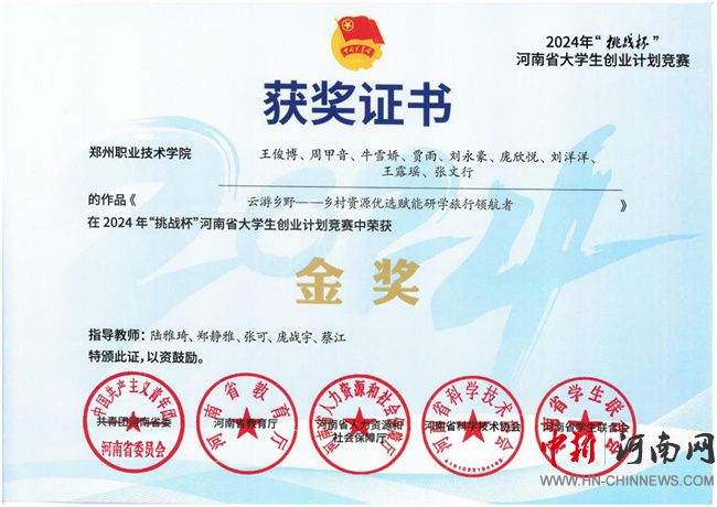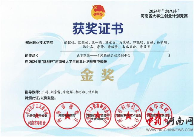 中新河南網11月26日電 近日,共青團河南省委、河南省教育廳、河南省人力資源和社會保障廳、河南省科學技術協(xié)會、河南省學生聯(lián)合會聯(lián)合下發(fā)《關于公布2024年“挑戰(zhàn)杯”河南省大學生創(chuàng)業(yè)計劃競賽獲獎名單的通知》,同時頒發(fā)了相應的榮譽證書。鄭州職業(yè)技術學院獲得金獎2項、銀獎4項、銅獎9項,10名教師榮獲優(yōu)秀教師,在獲獎質量、數(shù)量上取得了新的突破。