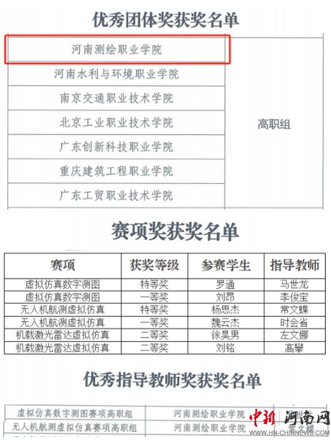 中新河南網11月28日電(陳賀) 11月25日,自然資源部人力開發(fā)中心發(fā)布《關于公布“南方測繪杯”第四屆全國大學生測繪地理信息虛擬仿真技能競賽獲獎結果的通知》。河南測繪職業(yè)學院師生喜獲佳績,榮獲特等獎2項,一等獎2項,二等獎2項,兩位老師獲優(yōu)秀指導教師,河南測繪職業(yè)學院獲高職組優(yōu)秀團體獎第一名。