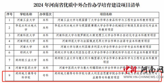 鄭州電力高等?茖W(xué)校入選2024年河南省優(yōu)質(zhì)中外合作辦學(xué)培育建設(shè)項(xiàng)目