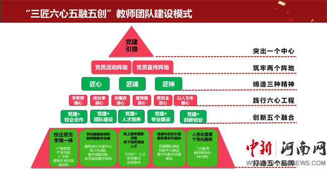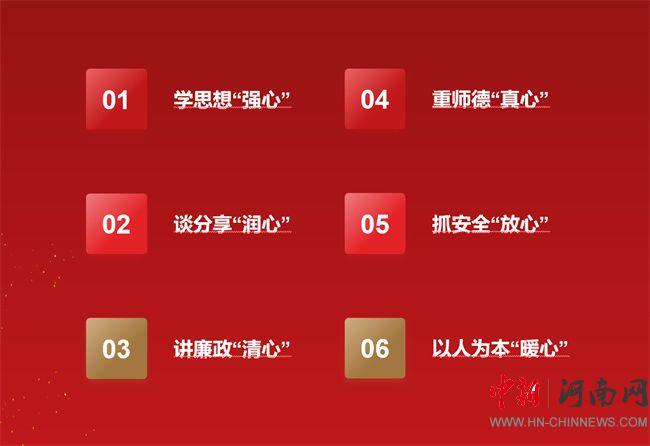 新鄉(xiāng)職業(yè)技術(shù)學(xué)院將對教育的博愛化成“六心”工程。即學(xué)思想“強心”、談分享“潤心”、講廉政“清心”、重師德“真心”、抓安全“放心”、以人為本“暖心”。在教師隊伍建設(shè)中,學(xué)校深度融入“六心”工程于日常。以強心堅守教育信念,以潤心關(guān)愛學(xué)生成長,以清心恪守師德規(guī)范,以真心永葆師德師風(fēng),以安心抓好校園安全,以暖心鑄就教育輝煌,大思政氛圍漸濃,育人無聲。