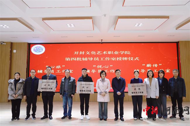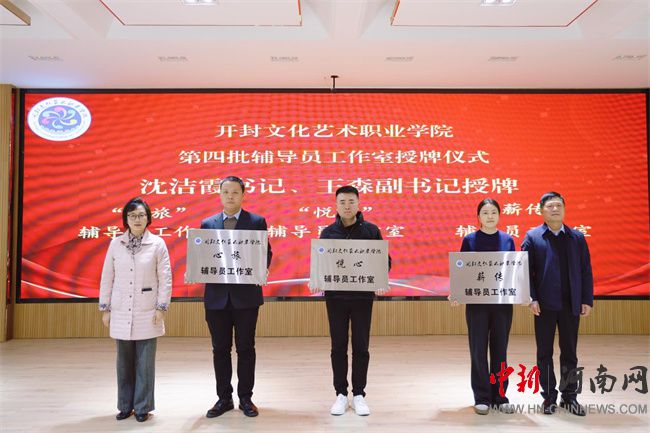 中新河南網(wǎng)12月6日電 12月5日下午,開(kāi)封文化藝術(shù)職業(yè)學(xué)院在4號(hào)報(bào)告廳舉行第四批輔導(dǎo)員工作室授牌儀式。開(kāi)封文化藝術(shù)職業(yè)學(xué)院黨委書記沈潔霞、黨委副書記王森、學(xué)工部部長(zhǎng)陳華、旅游管理學(xué)院黨總支書記李昶、旅游管理學(xué)院院長(zhǎng)林濤、音樂(lè)學(xué)院黨總支書記鄭軍強(qiáng)、文化傳媒學(xué)院黨總支書記李任暉、文化傳媒學(xué)院院長(zhǎng)褚自剛,以及各院部主管學(xué)生工作的副書記、副院長(zhǎng)、輔導(dǎo)員代表參加活動(dòng),授牌儀式由學(xué)生處副處長(zhǎng)孫宏達(dá)主持。