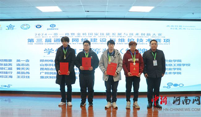 中新河南網(wǎng)12月16日電(寇鈞茗) 12月7日-8日,“一帶一路”暨金磚國家技能發(fā)展與技術(shù)創(chuàng)新大賽之通信網(wǎng)絡建設(shè)與維護技術(shù)賽項國內(nèi)賽決賽在山東信息職業(yè)技術(shù)學院舉行,本次大賽學生組約200位參賽選手齊聚一堂,經(jīng)過激烈角逐,鄭州電力高等?茖W校信通學院通信2301班鄭雨豪、通信2302班吳一含獲得學生組二等獎(銀牌)。
