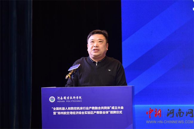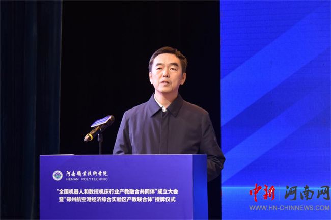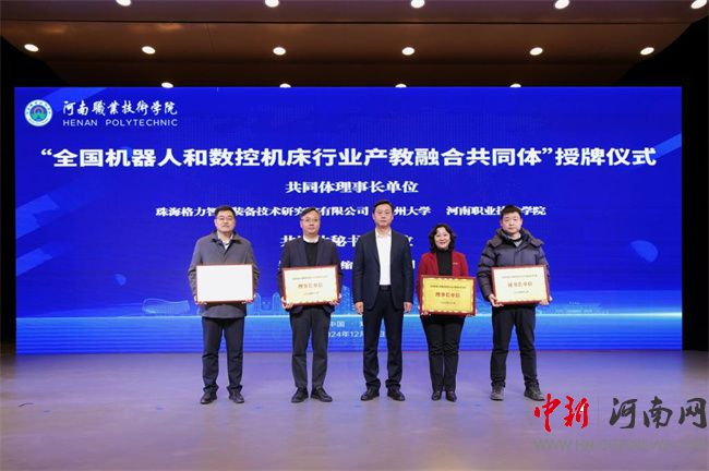 中新河南網(wǎng)12月21日電(鄧會敏) 12月19日上午,全國機(jī)器人和數(shù)控機(jī)床行業(yè)產(chǎn)教融合共同體成立大會暨鄭州航空港經(jīng)濟(jì)綜合實驗區(qū)產(chǎn)教聯(lián)合體授牌儀式在河南職業(yè)技術(shù)學(xué)院(以下簡稱該校)舉行。河南省教育廳黨組成員、副廳長張國強(qiáng),河南省工業(yè)和信息化廳黨組成員、副廳長孫永民,機(jī)械工業(yè)教育發(fā)展中心主任陳曉明,鄭州大學(xué)黨委常委、副校長胡少偉,珠海格力智能裝備技術(shù)研究院有限公司副總經(jīng)理陳威,富士康科技集團(tuán)富聯(lián)裕展科技(河南)有限公司副總經(jīng)理張占武,鄭州航空港經(jīng)濟(jì)綜合實驗區(qū)教育衛(wèi)生體育局副局長郭帥,河南省機(jī)器人與數(shù)控機(jī)床行業(yè)協(xié)會會長王濟(jì)昌等出席會議。該校黨委書記厲勵,黨委副書記、校長夏新顏等校領(lǐng)導(dǎo)班子成員,以及共同體、聯(lián)合體會員單位領(lǐng)導(dǎo)和代表近200人參加大會。大會分別由夏新顏和校黨委委員、副校長肖瓏主持。