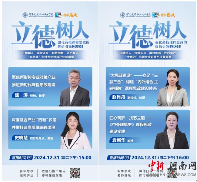 此次系列直播課,是學校貫徹落實立德樹人根本任務,全面推進課程思政建設,充分展示學校課程思政建設成效,促進課程思政建設經(jīng)驗分享交流的重要舉措。系列直播課共有4場,內(nèi)容以學校課程思政建設實踐為基礎,以耕讀教育賦能課程思政為特色。校長焦?jié)浴毒劢剐滦蝿輰I(yè)對接產(chǎn)業(yè),推進新時代課程思政建設》為主題分享了在專業(yè)建設過程中課程思政的全方位融入和建設經(jīng)驗。副校長趙肖丹以《河南建筑職業(yè)技術學院“大思政建設”——立足“三融三合”,構(gòu)建“內(nèi)外結(jié)合主輔相融”課程思政建設體系》為主題分享了學校課程思政建設的長效機制。教務處處長史曉慧、教授袁新華分別就相關主題展開精彩分享。建設信息工程系張華英主任主持的省級課程思政示范課程《計算機網(wǎng)絡技術》正在新華網(wǎng)“新華思政”平臺展播,累計學習達1.3萬人次。