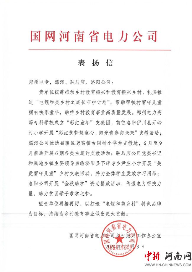 中新河南網(wǎng)1月3日電(王宣衡) 近日,國網(wǎng)河南省電力公司通報表揚鄭州電力高等?茖W校成立“彩虹童年”支教團,前往洛陽伊川縣亓嶺村小學開展“彩虹筑夢慧童心、陽光青春向未來”支教活動,對鄭州電力高等?茖W校校地結(jié)對幫扶工作取得的優(yōu)異成績給予充分肯定;對鄭州電力高等?茖W校在助力伊川縣鄉(xiāng)村振興過程中,展現(xiàn)出國家電網(wǎng)大國重器責任擔當?shù)那閼押蛧译娋W(wǎng)人特別能吃苦、特別能戰(zhàn)斗、特別能奉獻的企業(yè)精神給予高度評價。