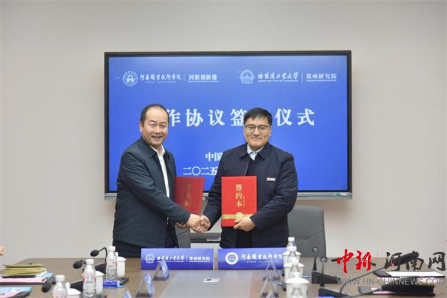 儀式上,夏新顏、劉銘輝分別代表雙方簽署戰(zhàn)略合作協(xié)議,任楓軒、鄂羽佳分別代表學校河職創(chuàng)新港和哈工大鄭州研究院河南哈鄭同心孵化器有限公司簽署入駐協(xié)議。