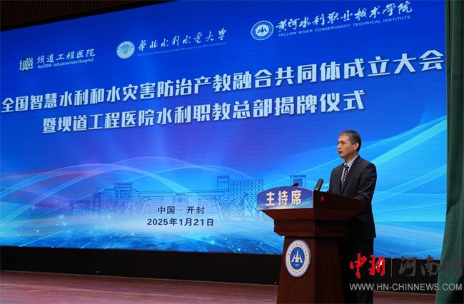 共同體發(fā)起單位、壩道醫(yī)院水利職教總部代表胡昊講話。他指出,共同體由匯集國內(nèi)外高端專家團隊、企業(yè)、科研院所和行業(yè)學(xué)會優(yōu)勢力量的壩道工程醫(yī)院、水利類一流本科院校的華北水利水電大學(xué)、全國“雙高計劃”A檔建設(shè)單位的黃河水利職業(yè)技術(shù)學(xué)院共同發(fā)起,實現(xiàn)了強強聯(lián)合。壩道工程醫(yī)院水利職教總部的成立將充分發(fā)揮壩道工程醫(yī)院在行業(yè)中的領(lǐng)航與示范作用,水利職教分院間將開展更廣泛的合作、更多元的對接、更深層的協(xié)同,實現(xiàn)多方資源優(yōu)化配置與高效利用。共同體的成立和水利職教總部的揭牌標(biāo)志著我們在探索產(chǎn)教融合新模式、推動水利職業(yè)教育高質(zhì)量發(fā)展的道路上又邁出了堅實的一步,將推動校企、校際深度協(xié)同,加快教育鏈、人才鏈與產(chǎn)業(yè)鏈、創(chuàng)新鏈的有效銜接,促進產(chǎn)教融合、科教融匯,促進水利新質(zhì)生產(chǎn)力發(fā)展。