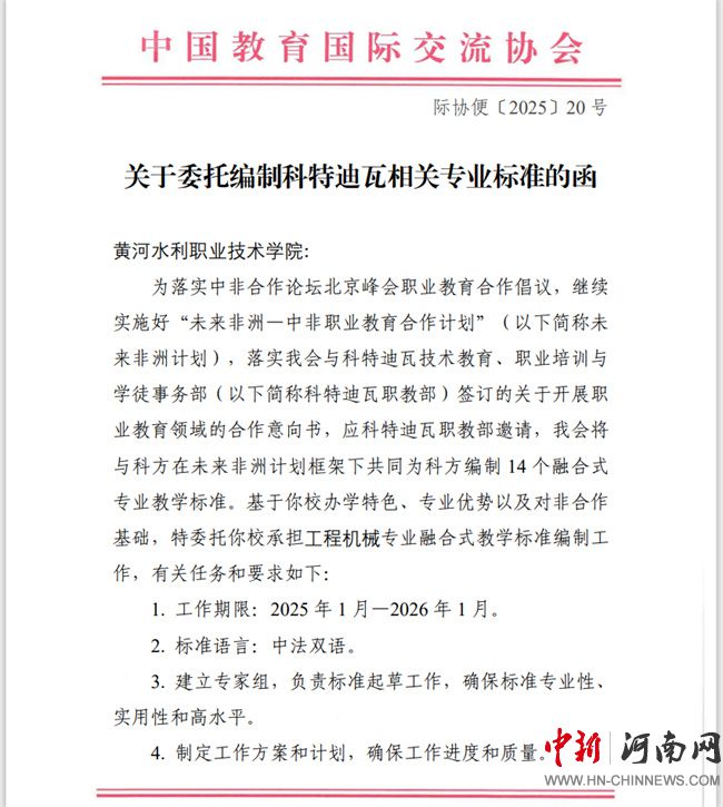 中新河南網2月20日電 近日,黃河水利職業(yè)技術學院(以下簡稱該校)申報的科特迪瓦職教項目“工程機械專業(yè)融合式教學標準”成功獲批,該標準被中國教育國際交流協會納入“未來非洲—中非職業(yè)教育合作計劃”(以下簡稱未來非洲計劃)。