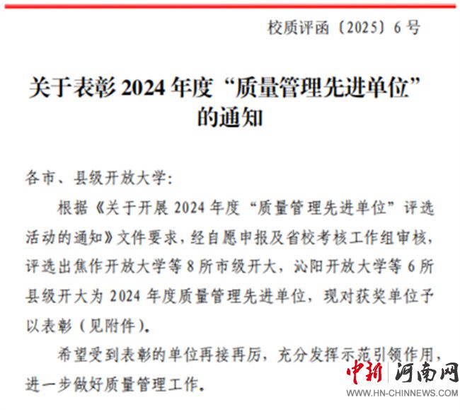 中新河南網(wǎng)3月13日電(王茜) 近日,河南開放大學(xué)發(fā)布了《關(guān)于表彰 2024 年度“質(zhì)量管理先進單位”的通知》的表彰通報,濟源開放大學(xué)榮獲2024年度河南開放大學(xué)系統(tǒng)“質(zhì)量管理先進單位”。