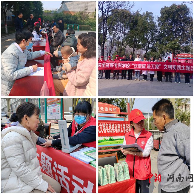 開展“送健康 進萬家”文明實踐主題活動。3月6日,我校師生赴校地結對幫扶點開展“送健康 進萬家”文明實踐主題活動,為泌陽縣花園街道北曹莊群眾做健康咨詢、測量血壓、推拿按摩、發(fā)放健康宣傳資料和開展健康素養(yǎng)調查問卷等活動,將專業(yè)醫(yī)療服務和健康知識送到群眾“家門口”,引導廣大居民養(yǎng)成健康生活習慣,成為健康第一責任人。以實際行動踐行雷鋒精神,助力鄉(xiāng)村振興;顒蝇F場設置內科、外科、兒科等義診區(qū)域,并特別設置了醫(yī)療按摩區(qū)、健康宣教區(qū)。累計服務群眾120余人次,發(fā)放健康手冊200余份,調查問卷110余份。當地居民紛紛表示,這樣的活動“貼心、實在”,希望今后能常態(tài)化開展。