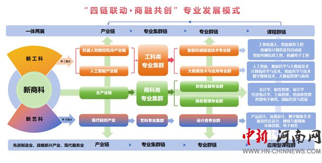 依托河南省和鄭州市重點產(chǎn)業(yè)鏈,面向先進制造業(yè)、戰(zhàn)略新興產(chǎn)業(yè)、現(xiàn)代服務(wù)業(yè)三大產(chǎn)業(yè),打造工科類、商科類、藝科類三大專業(yè)集群,形成與區(qū)域產(chǎn)業(yè)高度匹配的智能機械制造技術(shù)專業(yè)群、大數(shù)據(jù)技術(shù)與應(yīng)用專業(yè)群、財務(wù)金融專業(yè)群、商務(wù)管理專業(yè)群、設(shè)計類專業(yè)群六大專業(yè)群。