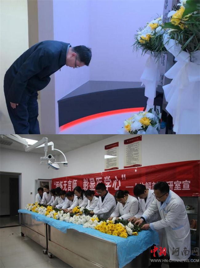 儀式結(jié)束后,師生代表依次向“無言良師”紀(jì)念碑敬獻鮮花。其余學(xué)生走進人體解剖學(xué)第4實驗室,向“大體老師”獻上菊花并鞠躬致禮。一朵朵鮮花寄托著哀思,更承載著對醫(yī)學(xué)精神的傳承之志。參與學(xué)生表示:“親手觸摸生命的奧秘,更深刻體會到‘大體老師’用身軀托起醫(yī)學(xué)未來的意義。我們定不負(fù)所托,成為有溫度、有擔(dān)當(dāng)?shù)尼t(yī)者。”