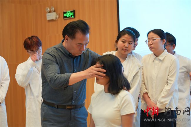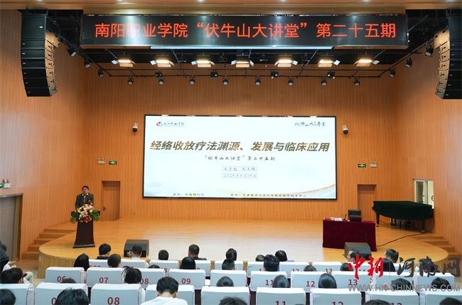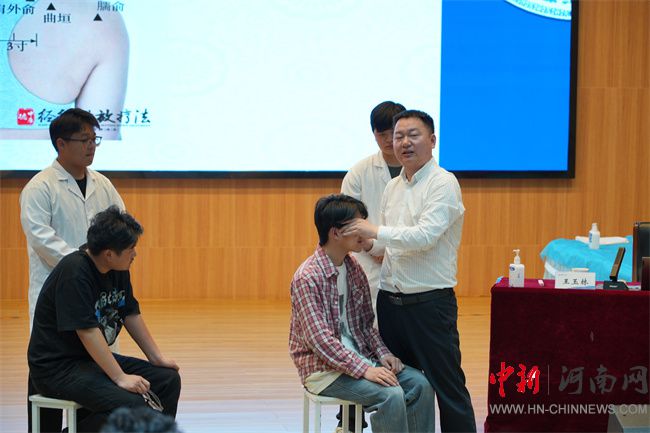 座談會(huì)后,張喜欽、吳金魁、王玉林三位傳承人通過(guò)“經(jīng)絡(luò)收放療法淵源、發(fā)展與臨床應(yīng)用”專(zhuān)題講座進(jìn)一步深化交流,為南陽(yáng)職業(yè)學(xué)院師生及校醫(yī)院醫(yī)護(hù)人員帶來(lái)精彩講座。張喜欽作為“張氏經(jīng)絡(luò)收放療法”代表性傳承人,深耕中醫(yī)臨床四十余年,系統(tǒng)傳承并創(chuàng)新發(fā)展了張氏療法,在講座現(xiàn)場(chǎng)演示“清腦術(shù)”技法,展示了張氏經(jīng)絡(luò)收放療法“五穴”“四定”“三到”“雙調(diào)”“一運(yùn)”的施治原則,讓師生直觀(guān)感受非遺技藝的臨床價(jià)值。第四代傳承人吳金魁以其深厚的專(zhuān)業(yè)素養(yǎng)和豐富的實(shí)踐經(jīng)驗(yàn),從“何為經(jīng)絡(luò)收放療法”入手,梳理了該療法從清末張德文創(chuàng)立以來(lái)歷經(jīng)四代的傳承脈絡(luò),以及如今形成的“醫(yī)教研”三位一體的發(fā)展格局。第五代傳承人王玉林聚焦“清腦術(shù)”實(shí)操規(guī)范,通過(guò)眼周四穴與耳后五穴的同步教學(xué),指導(dǎo)師生掌握頭痛、失眠等癥狀的干預(yù)技巧。
