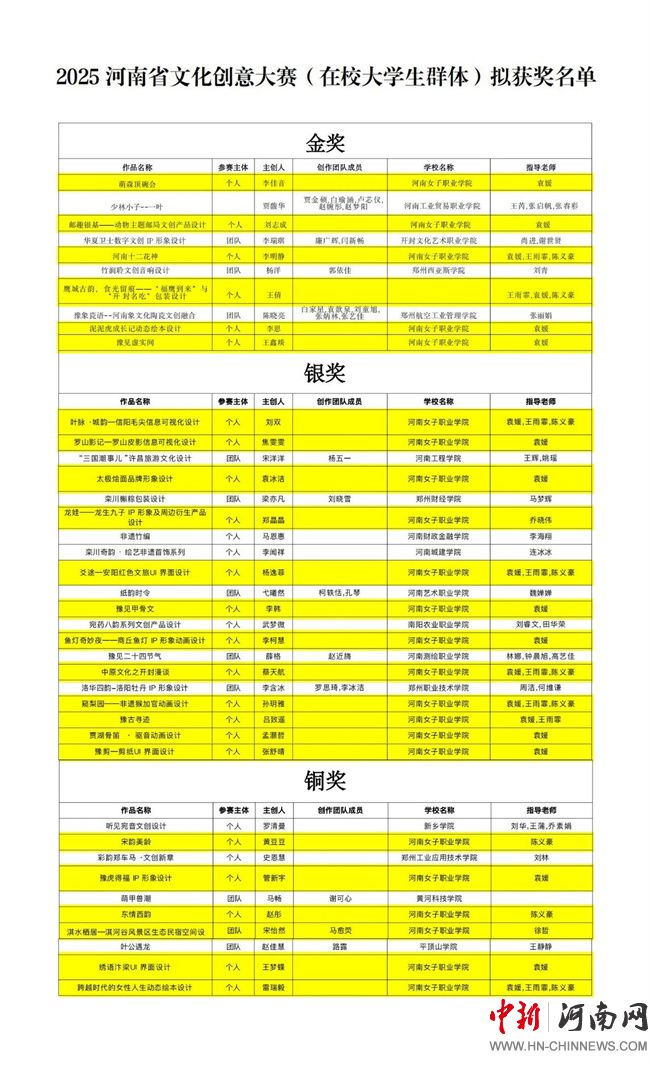 中新河南網(wǎng)8月3日電 近日,河南省教育廳公布2025年河南省文化創(chuàng)意大賽(在校大學(xué)生群體)決賽獲獎結(jié)果。河南女子職業(yè)學(xué)院美術(shù)與設(shè)計學(xué)院師生再創(chuàng)輝煌,斬獲24獎項榮譽,包括金獎6項、銀獎12項和銅獎6項,并獲工作突出高校,充分展現(xiàn)了學(xué)校及學(xué)院在文創(chuàng)教育領(lǐng)域的扎實功底與創(chuàng)新活力。