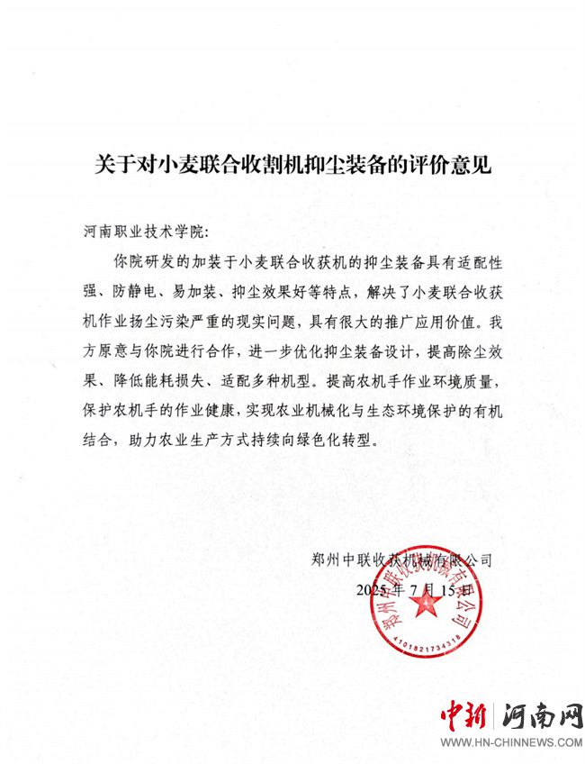 圖11 鄭州中聯(lián)收獲機(jī)械有限公司《關(guān)于對小麥聯(lián)合收割機(jī)抑塵裝備的評價意見》