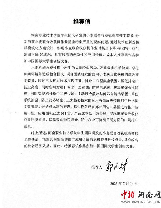 團(tuán)隊與鄭州樸華科技有限公司、鄭州中聯(lián)收獲機(jī)械有限公司協(xié)作推進(jìn)技術(shù)轉(zhuǎn)化,通過輕量化設(shè)計、模塊化改造,使設(shè)備適配多種機(jī)型。在登封、新鄭等5縣區(qū)的611畝麥田推廣中,農(nóng)機(jī)手反饋“視野清晰了,呼吸順暢了”,鄭州中聯(lián)收獲機(jī)械有限公司評價對本設(shè)備做出評價意見:“該設(shè)備具有防靜電、自清潔、易裝配等優(yōu)點,具有重大推廣價值”。
