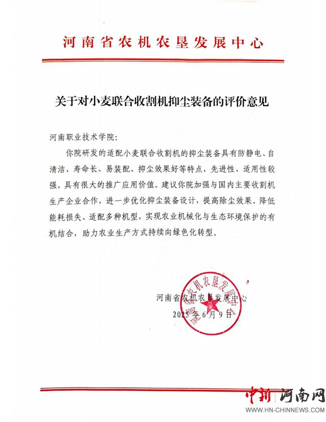 河南省農(nóng)機(jī)農(nóng)墾發(fā)展中心出具相關(guān)評價: