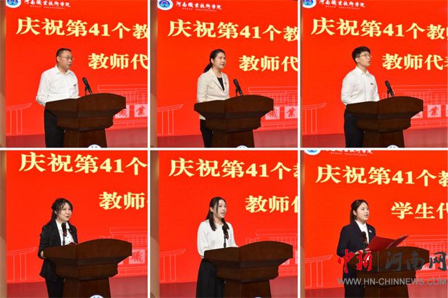 會上,校黨委委員、副校長李玉峰宣讀了河南省2025年優(yōu)秀教師、2024年度河南省事業(yè)單位人員定期獎勵“記功”教師、2022-2024年突出貢獻(xiàn)人員、光榮從教30年教師、2024-2025年度“三育人”先進(jìn)個人的相關(guān)表彰文件。校領(lǐng)導(dǎo)厲勵、夏新顏、肖瓏分別為受表彰教師頒發(fā)榮譽證書和紀(jì)念獎牌。劉擁軍、王利琴、張一寧、童俊艷、王蕊等五位教師代表,結(jié)合自身工作成長經(jīng)歷,從科研創(chuàng)新、教書育人、管理服務(wù)等方面分享了心得體會;學(xué)生代表史文琪圍繞自身求學(xué)經(jīng)歷表達(dá)了對師長關(guān)懷的感恩之情。隨后,校黨委副書記、校長夏新顏帶領(lǐng)與會全體教職員工重溫教師誓詞,進(jìn)一步堅定職業(yè)信念,增強(qiáng)責(zé)任感、使命感與榮譽感。