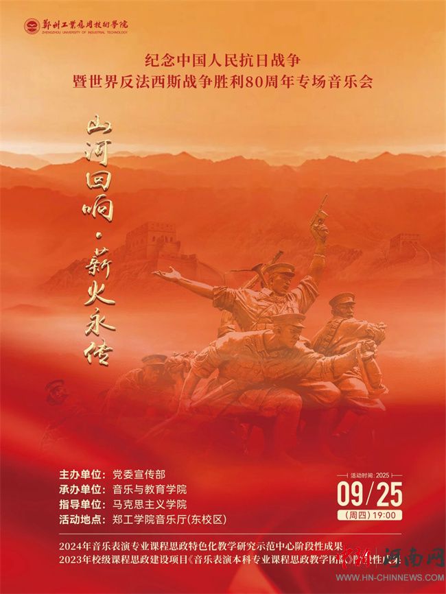 中新河南網(wǎng)9月25日電 2025年是中國人民抗日戰(zhàn)爭暨世界反法西斯戰(zhàn)爭勝利80周年。這場偉大戰(zhàn)爭是中華民族歷史上的一座重要里程碑,中國人民以巨大的民族犧牲和精神力量,為世界反法西斯戰(zhàn)爭的勝利作出了不可磨滅的貢獻(xiàn)。為銘記這段烽火歲月,弘揚(yáng)偉大的抗戰(zhàn)精神,鄭州工業(yè)應(yīng)用技術(shù)學(xué)院將于9月25日19:00在東校區(qū)音樂廳舉辦 “山河回響・薪火永傳” ——紀(jì)念中國人民抗日戰(zhàn)爭暨世界反法西斯戰(zhàn)爭勝利80周年專場音樂會。