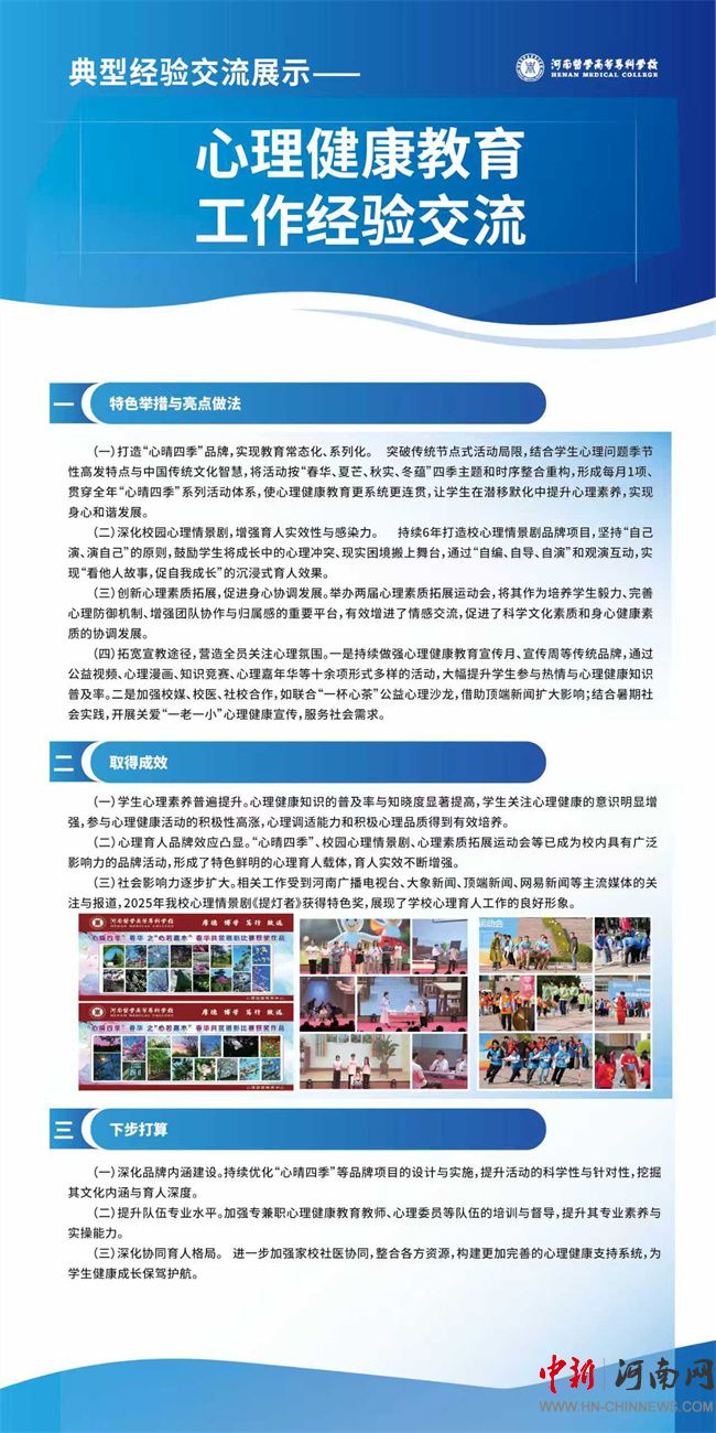 系列舉措取得了扎實成效。目前,學(xué)生心理素養(yǎng)普遍提升,主動關(guān)注心理健康的意識顯著增強;“心晴四季”、心理情景劇等心理育人品牌效應(yīng)凸顯,形成了特色鮮明的育人載體;相關(guān)工作獲河南廣播電視臺等主流媒體多次報道,心理情景劇《提燈者》榮獲特色獎,社會影響力逐步擴大。
