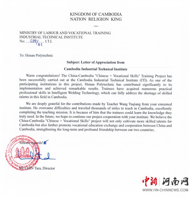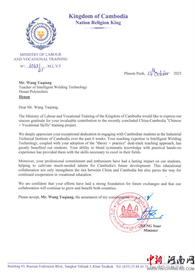 中新河南網(wǎng)10月29日電(王亞強、韓瑞) 近日,河南職業(yè)技術(shù)學院收到來自柬埔寨勞工與職業(yè)培訓部和工業(yè)技術(shù)學院發(fā)來的兩封感謝信。信中寫道:感謝你們?yōu)橹袊?mdash;柬埔寨“中文+職業(yè)技能”項目所做的貢獻,王亞強老師傾心指導柬埔寨學員的敬業(yè)精神令人感佩,您憑借智能焊接技術(shù)領(lǐng)域的專業(yè)造詣,采用“理論+實踐”雙軌并行的教學模式,使學員們受益匪淺……