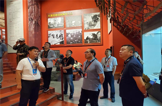 在紅旗渠分水閘,通過(guò)巨幅照片,大家深刻感受紅旗渠通水,徹底改善林縣人民"十年九旱、水貴如油"的惡劣生存環(huán)境,從根本上解決了林縣人民吃水難用水難問(wèn)題那一刻,群眾內(nèi)心所迸發(fā)出的喜悅之情。