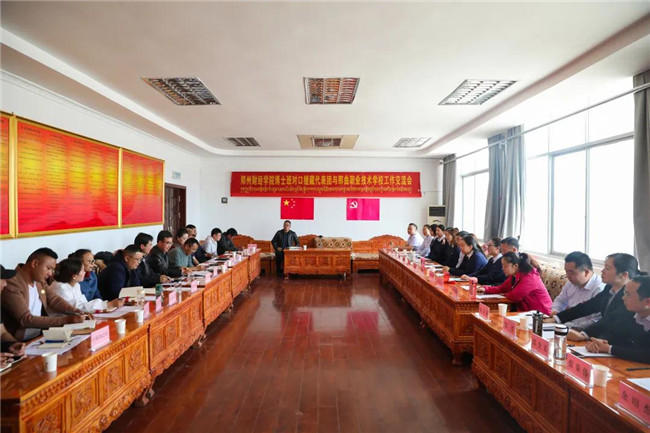 雙方首先在那曲職校藏式會議室舉行對口援助工作交流會。那曲市教育局黨組成員、那曲職校黨委書記丁濤,那曲職校副校長尼瑪次仁、副校長賀衛(wèi)博及該校政教科、辦公室、總務(wù)科、教務(wù)科、學(xué)生科、財務(wù)室、圖書館、招就科等相關(guān)部門負(fù)責(zé)人,鄭州財經(jīng)學(xué)院援藏代表團(tuán)全體成員參加交流會,會議由尼瑪次仁主持。