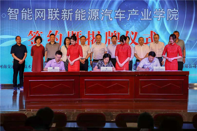 會上,產(chǎn)、學(xué)、研三方代表在與會領(lǐng)導(dǎo)見證下,正式簽署戰(zhàn)略合作協(xié)議。曹焱、成波、劉慧兵一起為產(chǎn)業(yè)學(xué)院揭牌。來自省內(nèi)外的院校代表、企業(yè)代表和河南交院師生代表近200人齊聚活動現(xiàn)場,共同見證產(chǎn)學(xué)研深度融合合作模式開啟。