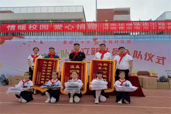 中新河南網(wǎng)5月31日電:5月31日上午,開(kāi)封市城鄉(xiāng)一體化示范區(qū)水稻鄉(xiāng)于良砦社區(qū)支部書(shū)記張洪君攜手延臻建設(shè)、青云電力到金明實(shí)驗(yàn)西校區(qū)參加“六一”慰問(wèn)儀式,為同學(xué)們送去書(shū)包、文具盒、削筆器等學(xué)習(xí)用品,用愛(ài)心助力孩子成長(zhǎng)。孩子們?yōu)樗麄兿瞪霞t領(lǐng)巾敬少先隊(duì)禮表示感謝。(王媛媛)