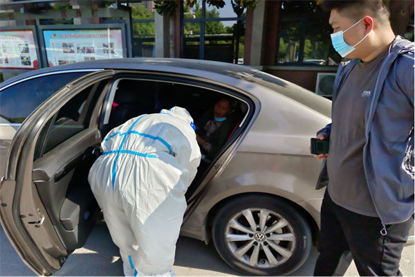 可愛(ài)的“大白”不顧一中午的疲憊走出工作區(qū),為行動(dòng)不便的居民采集核酸。