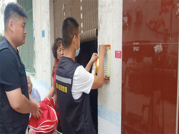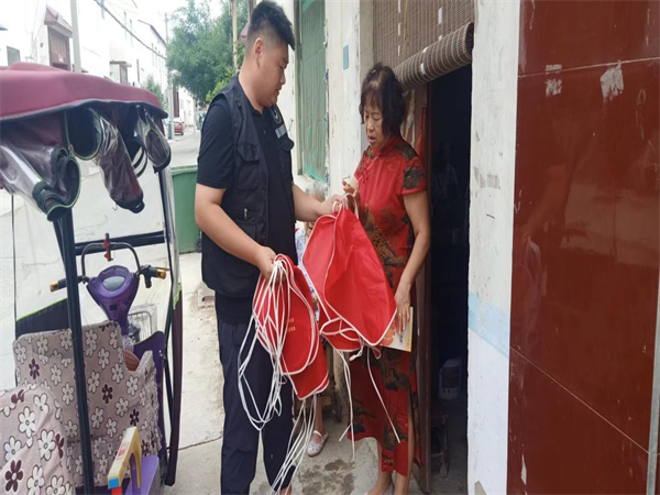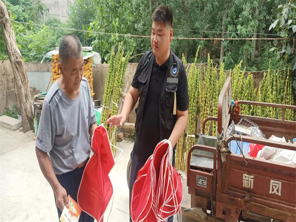 工作人員入戶發(fā)放宣傳物品,在社區(qū)顯眼處、人流量較多處張貼消防安全宣傳頁。