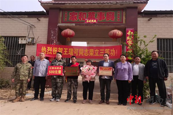 中新河南網(wǎng)4月18日電:為弘揚擁軍優(yōu)屬光榮傳統(tǒng),營造全社會尊崇軍人的良好氛圍,4月18日上午,開封市示范區(qū)杏花營農(nóng)場聯(lián)合區(qū)退役軍人事務(wù)局、區(qū)人民武裝部為榮立三等功的現(xiàn)役軍人家庭送上立功喜報,讓軍人軍屬共享榮耀和喜悅。
