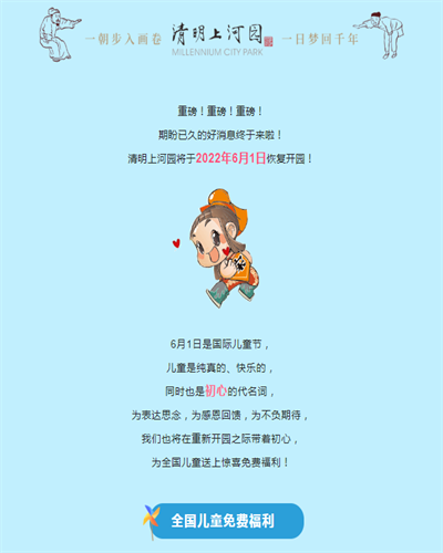 6月1日是國(guó)際兒童節(jié),兒童是純真的、快樂(lè)的,初心的代名詞,為表達(dá)思念,為感恩回饋,為不負(fù)期待,清明上河園將在重新開(kāi)園之際帶著初心,為全國(guó)兒童送上驚喜免費(fèi)福利!