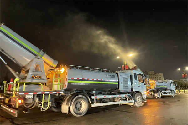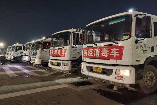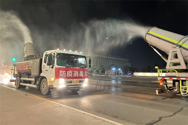 晚9點(diǎn),工作人員和消殺車輛已全部準(zhǔn)備就緒,隨著裝有消毒水的大型霧炮車、步道車、消毒灑水車緩緩駛向街道,消殺工作全面啟動(dòng)。