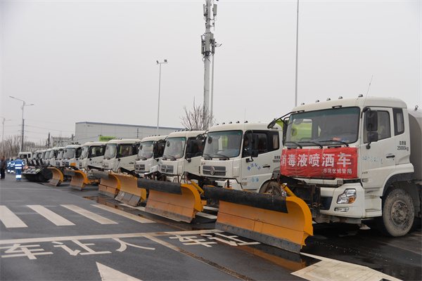 完成對(duì)新設(shè)備的調(diào)試及原有除雪機(jī)械的維修保養(yǎng)。做好應(yīng)急設(shè)備和物資的儲(chǔ)備,全面檢測(cè)各類機(jī)械設(shè)備。共準(zhǔn)備推雪板34臺(tái)、雪滾車3臺(tái)、撒布機(jī)12臺(tái)、融雪車6臺(tái)、融雪劑1000余噸、鐵鍬1000余把、掃帚1000余把,環(huán)衛(wèi)工人1200余人隨時(shí)待命。