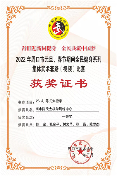 商水縣陳氏太極拳訓(xùn)練中心榮獲全民健身系列(視頻)集體武術(shù)套路比賽一等獎