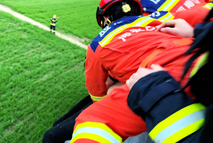 在家人與男子溝通之際,二組救援人員趁男子不注意,立刻從后方把男子救上來。