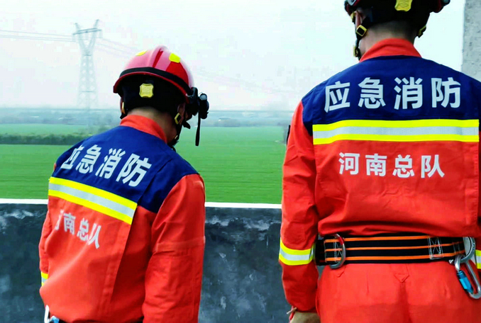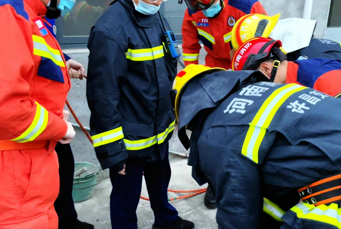 針對(duì)現(xiàn)場(chǎng)情況,指揮員立馬分派兩組人員同時(shí)進(jìn)行營救,一組救援人員在下方警戒,并疏散周圍圍觀群眾。同時(shí),二組救援人員穿戴好防護(hù)裝備,從房屋樓頂來到男子的后方。