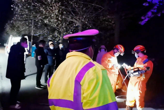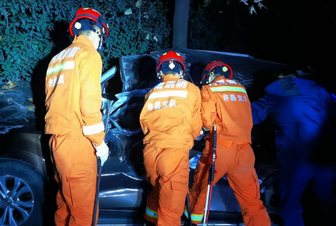 河南禹州:凌晨一輛汽車撞上道路石墩 消防隊員連夜趕赴破拆救援
