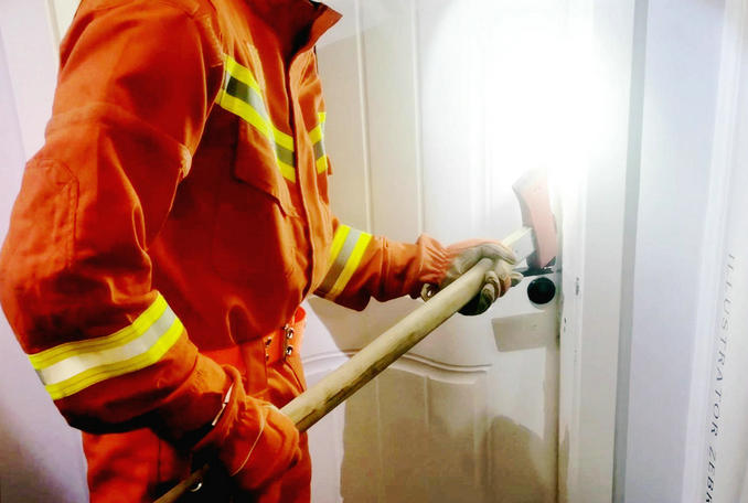 現(xiàn)場指揮員立即下達作戰(zhàn)指令,命令參戰(zhàn)人員利用消防斧、撬杠、液壓擴張器等破拆工具對房門進行破拆。由于破拆聲響較大,小女孩受到驚嚇后情緒十分激動,經(jīng)家人和現(xiàn)場救援人員多次安慰后,情緒稍微緩和。