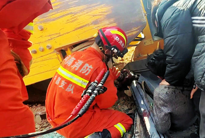 到達(dá)現(xiàn)場后,消防救援人員首先對推土機結(jié)構(gòu)進行查看。經(jīng)觀察和詢問,被困人員在駕駛車輛中,因操作不慎導(dǎo)致車輛側(cè)翻,其雙腿被駕駛室座椅壓住無法移動,司機傷勢較重。