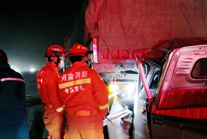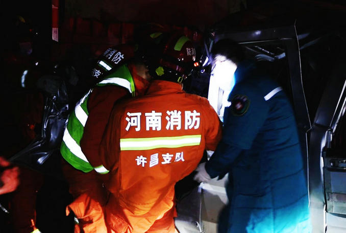 河南鄢陵:兩輛貨車發(fā)生追尾一人被困 消防隊員立即趕赴破拆救援