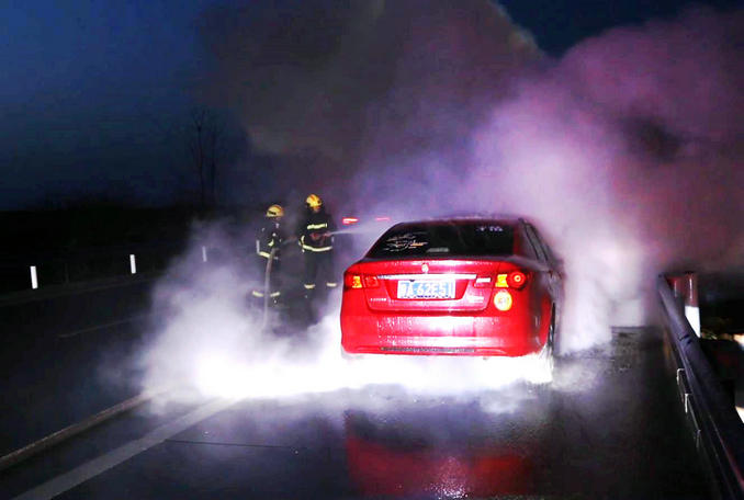 到達(dá)現(xiàn)場(chǎng)后,消防救援人員發(fā)現(xiàn):一輛紅色的小轎車(chē)發(fā)生自燃,發(fā)動(dòng)機(jī)艙有滾滾濃煙正在冒出,隨時(shí)有爆燃的危險(xiǎn)。