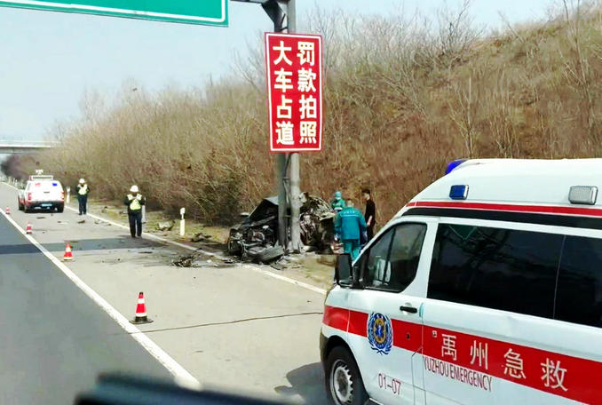 到達(dá)現(xiàn)場(chǎng)后,消防救援人員發(fā)現(xiàn):一輛轎車撞向高速公路的路牌支柱,車輛整體旋轉(zhuǎn)180度,車頭部位嚴(yán)重?fù)p毀,駕駛室變形,駕駛員雙腿被卡在儀表臺(tái)下方。經(jīng)醫(yī)護(hù)人員簡(jiǎn)單檢查,被困駕駛員意識(shí)清醒,暫無(wú)生命危險(xiǎn)。