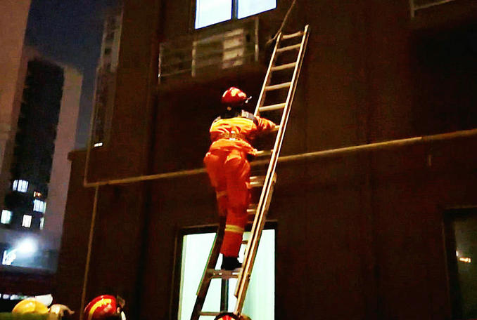 在做好安全保護(hù)的前提下,一名救援人員爬梯成功進(jìn)入臥室打開房門。