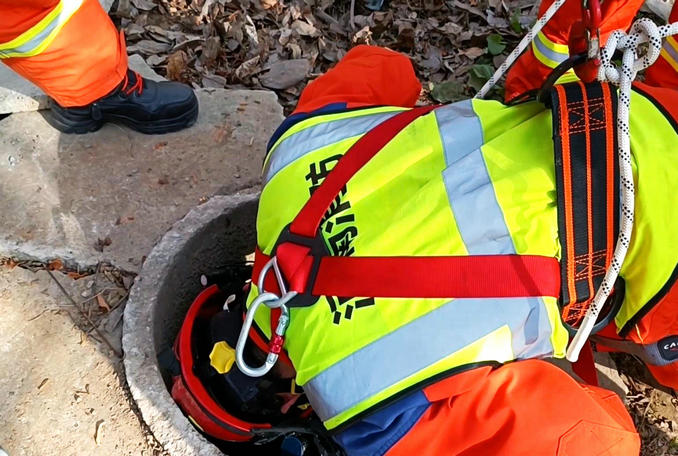 救援人員立即將空呼氣瓶放入井內(nèi),避免被困老人因缺氧導(dǎo)致窒息。經(jīng)過對(duì)現(xiàn)場(chǎng)偵察、井下環(huán)境評(píng)估后,救援人員展開救援三腳架,安排一名身材相對(duì)瘦小的消防員承擔(dān)下井救援任務(wù)。